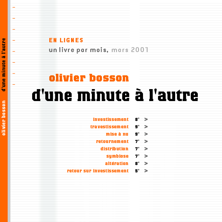 | [nettime-fr] en mars sur enlignes, Olivier Bosson, "d'une minute àl'autre" |
